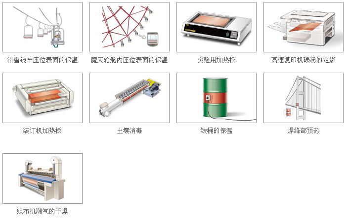 可運用在電器盒除濕、杯類加熱、 IC晶圓加熱、食品保溫袋產品、水床加熱器、電熱衣架、毛巾箱、干燥箱、汽車擋雪電熱片、機車把手、美容瘦身電毯、睫毛器….等。